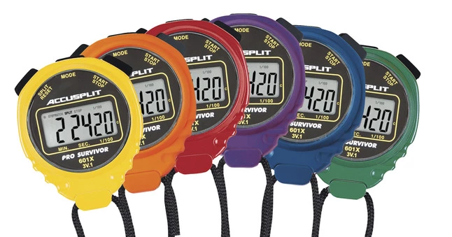 Accusplit Pro Survivor Stopwatch Set of 7 includes one each of red, yellow, blue, green, orange, purple and black stopwatches. It is ergonomically designed with the exclusive extra performance “X” case. The “X” case includes special million cycles switches that operate cleanly, precisely and reliably every time. It is shock and water resistant. Stopwatch has cumulative split-timing, event/time out, 1,2 fast finish, split/release action, time interval 1/100 second to 40 minutes, time and date functions with 24 hour timing range. It comes with breakaway safety lanyard and battery.