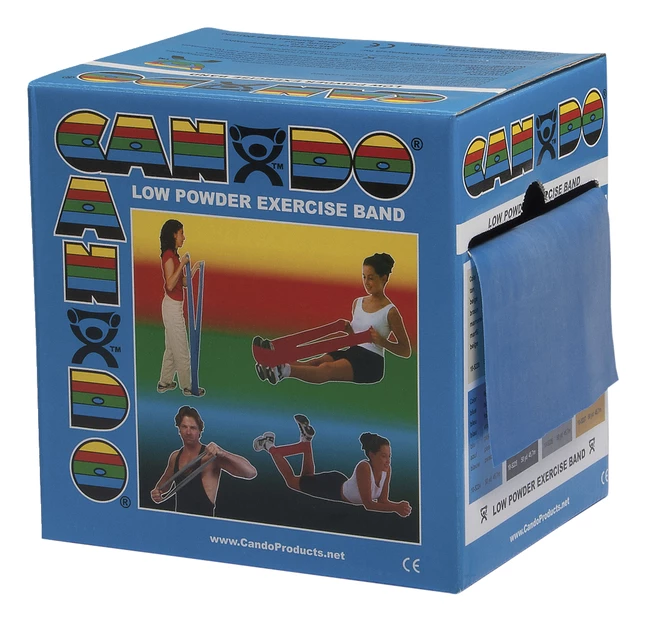 CanDo high quality latex resistive exercise band has been used in clinics for rehabilitation, conditioning and training since 1987. It has become a well-known staple of many physical therapy programs. CanDo exercise band is an economic solution for upper and lower body exercise. Effective when used alone, or with handles and anchors. CanDo is licensed to use the Thera-Band color sequence so resistance level is easily identified. 50-yard rolls have a core that fits most dispenser racks. CanDo low powder exercise band is made of natural rubber latex, which may cause allergic reactions. For those with latex sensitivities, there are latex-free alternative offerings of CanDo exercise band.