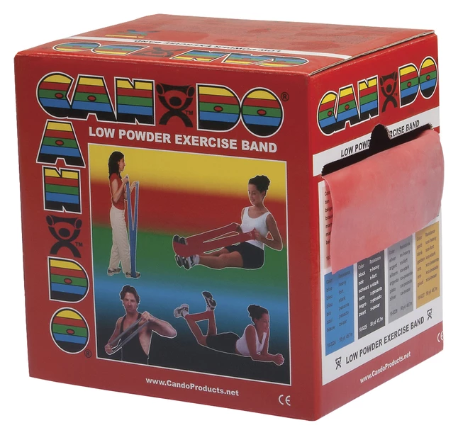 CanDo high quality latex resistive exercise band has been used in clinics for rehabilitation, conditioning and training since 1987. It has become a well-known staple of many physical therapy programs. CanDo exercise band is an economic solution for upper and lower body exercise. Effective when used alone, or with handles and anchors. CanDo is licensed to use the Thera-Band color sequence so resistance level is easily identified. 50-yard rolls have a core that fits most dispenser racks. CanDo low powder exercise band is made of natural rubber latex, which may cause allergic reactions. For those with latex sensitivities, there are latex-free alternative offerings of CanDo exercise band.