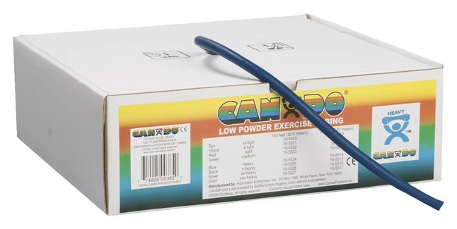 CanDo high quality latex resistive exercise tubing has been used in clinics for rehabilitation, conditioning and training since 1987. It has become a staple of many physical therapy and athletic training programs. CanDo exercise tubing is an economic solution for upper and lower body exercise. Effective when used alone, or with handles and anchors. CanDo is licensed to use the Thera-Band color sequence so resistance level is easily identified. CanDo low powder exercise tubing is made of natural rubber latex, which may cause allergic reactions. For those with latex sensitivities, there are latex-free alternative offerings of CanDo exercise tubing.