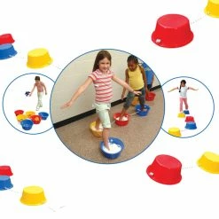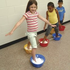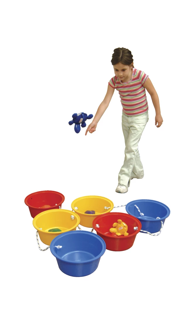 - Six brightly colored buckets connected by a braided nylon rope