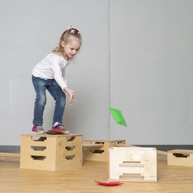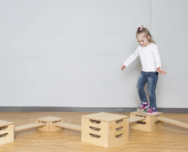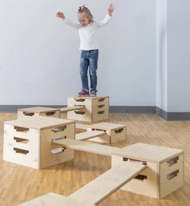 - This versatile, wooden balance set is a series of 6 boxes and 6 planks that connect at different heights and angles to create fun patterns for children to walk across and practice balance.