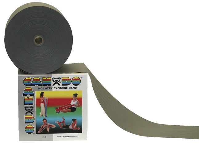 CanDo® resistive band exerciser roll is packaged in a dispenser box. Simply unroll desired length of exercise band from dispenser box and cut with scissors. CanDo® high quality synthetic latex free exercise band has been used for physical therapy and athletic training by clinics, fitness centers and individuals since 1987. It has become a well known staple of many physical therapy programs. The latex free formula has been specially created to mimic the stretch characteristics of latex band. CanDo® exercise band is an economic solution for upper and lower body exercise. Lightweight, compact and portable. Durable. Effective when used alone, or with handles and anchors. Color-coded according to the exercise band’s resistance. CanDo® is licensed to use the Thera-Band® color sequence so resistance level is easily identified. Available in 8 levels of resistance for progressive exercise. 50-yard rolls have a core that fits most dispenser racks. Levels range in order of strength from least to greatest resistance: tan, yellow, red, green, blue, black, silver, gold. Uniform width – each band is 5 inches wide.