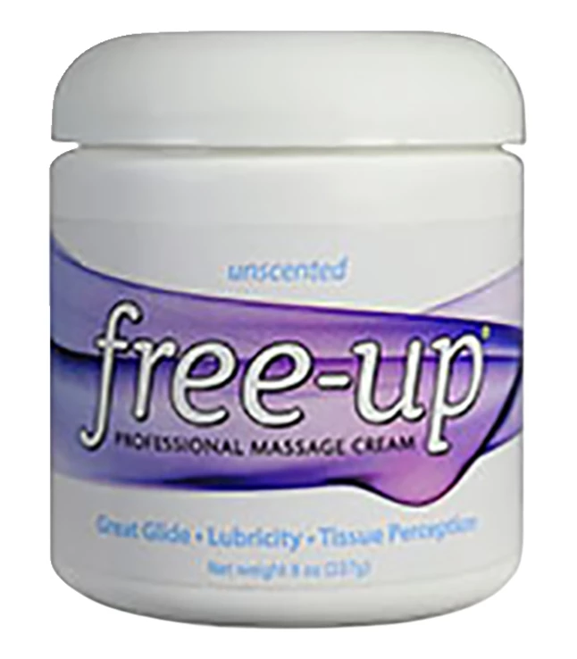 Formulated exclusively for the healthcare professional, Free-Up® Massage Cream is noted for its glide, lubricity and tissue perception. It features a great glide and tissue sense for fingers and hands. Free-Up® does not inhibit deep tissue perception or discrimination. It has a slow absorption rate and won’t ball up or dry out the skin. Free-Up Massage Cream comes in an 8 oz container and does not contain beeswax. It is both Bacteriostatic and Hypo-allergenic.