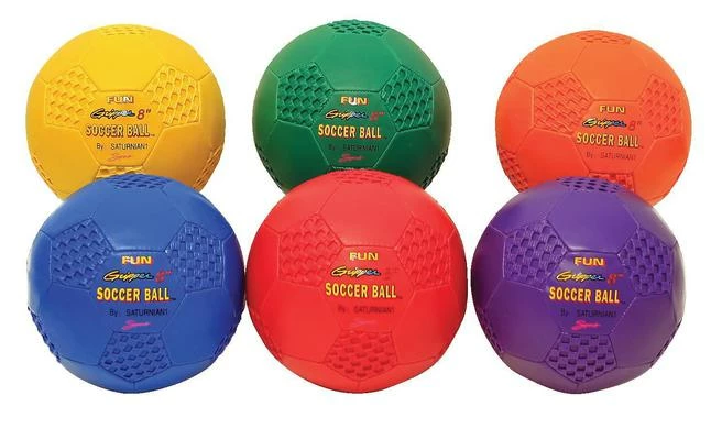FunGripper 8 inches Soccerball features a unique foam-matrix outer cover, offering an unparalleled sure-grip surface and cushioned-softness. High-quality, butyl-rubber bladder ensures maximum air retention and a perfect bounce, while the durable synthetic body guarantees long-lasting life. Soccerball is easy to hold, throw and catch. Set includes 6 Soccerballs with one in each color: Red, Yellow, Blue, Green, Purple and Orange.