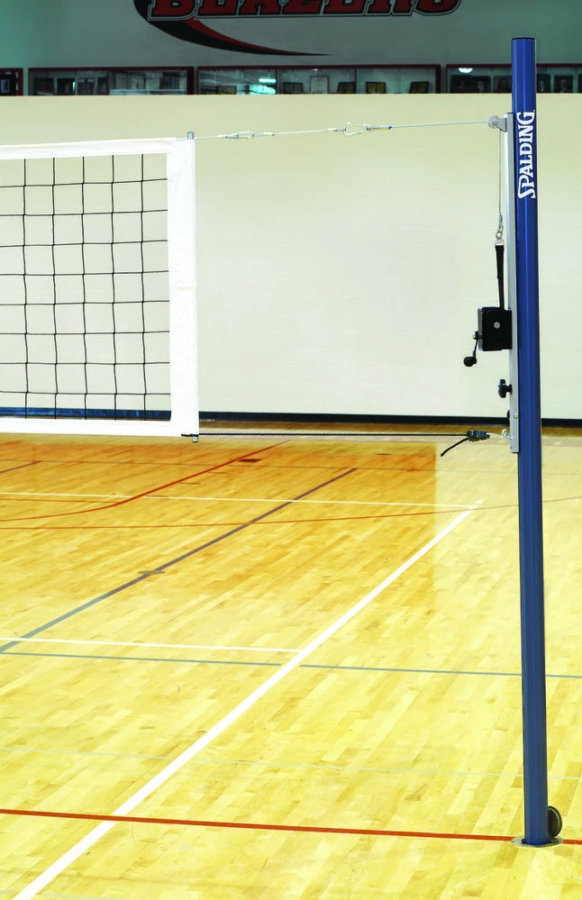 Spalding Two-Court Slide Volleyball System featuring 3 in OD aluminum construction has sliding adjustments. System includes 2 winch end uprights, 1 center upright, 2 Quik-Set nets, 1 center upright pad, 2 pairs of antennae and 1 pair of upright end pads. Floor plates and sleeves sold separately.