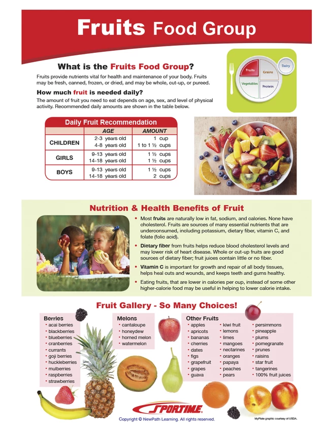 - Fruits food group learning guide is an excellent nutrition education teaching aid to use alone or conjoined with other MyPlate or food-related Sportime Visual Learning Guides (sold separately)