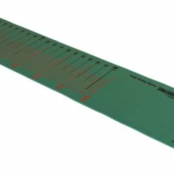 Made of carpet-like material with a rubber backing to prevent it from slipping. It’s marked with metric, feet and inches for convenient measuring. Includes a nylon storage bag with hook and loop strap for security. Measures 26-1/2 inches x 11 feet.