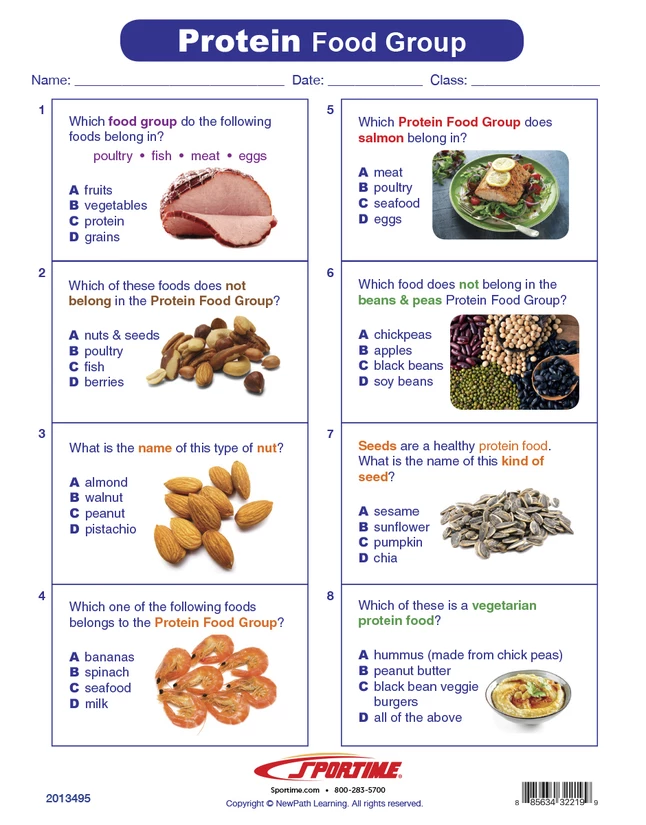 - Protein food group learning guide is an excellent nutrition education teaching aid to use alone or conjoined with other MyPlate or food-related Sportime Visual Learning Guides (sold separately)