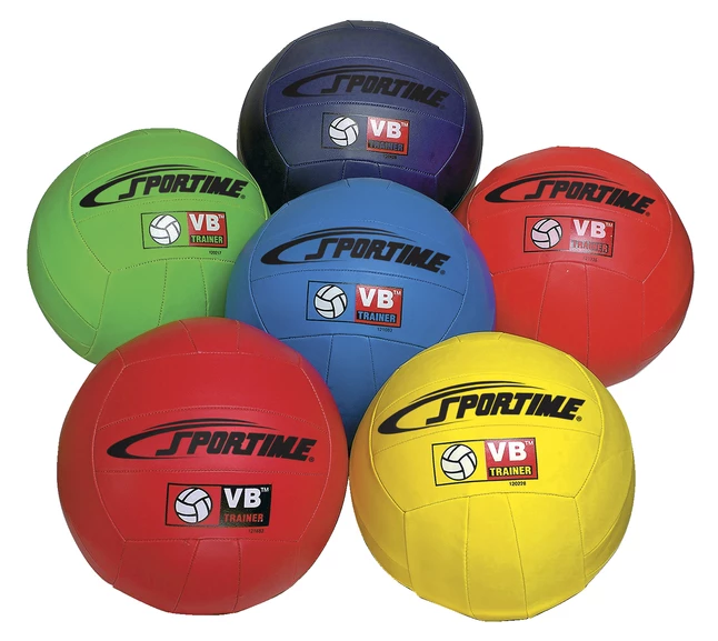 Enjoy sting-free serves, sets, and bumps with these larger lightweight volleyball trainers. The Sportime VB-Trainer is 40 percent lighter and 25 percent larger than a regulation volleyball for beginner players. Plus, its softer exterior is made that to take the sting out of repetitive skill drills and eliminate the fear out of getting hit. Slower moving ball allows time to get in position, track the ball, and make the correct play. Ball is machine-stitched synthetic leather with polyurethane bladder for shape retention. Not recommended for outdoor play. Sold as set of 6 in bright assorted colors.
