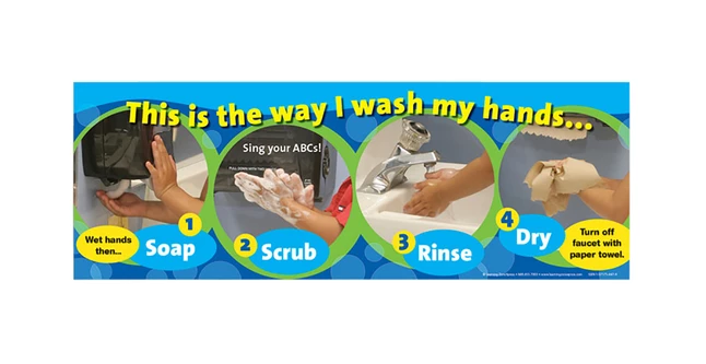 This step-by-step guide shows young children the four steps for proper hand washing. It encourages children to sing the A, B, C’s while they wash their hands. 8-1/2 x 24 inch laminated poster. .
